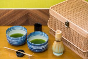 お部屋には約1、2畳ほどの畳と抹茶セットをご用意しております。お抹茶はお作法にとらわれず気軽にお楽しみください。