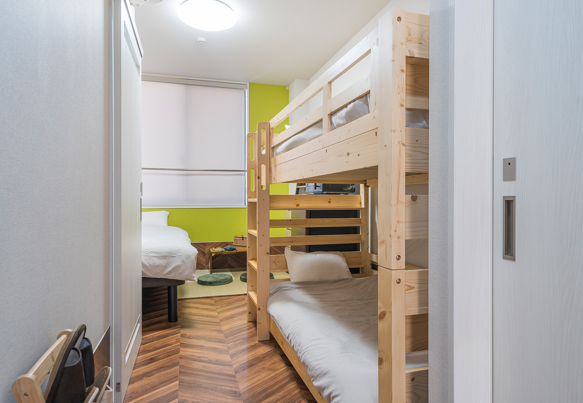 2段ベッド・ダブルベッド・ソファベッドの3タイプのベッドを備えた多機能ルーム。